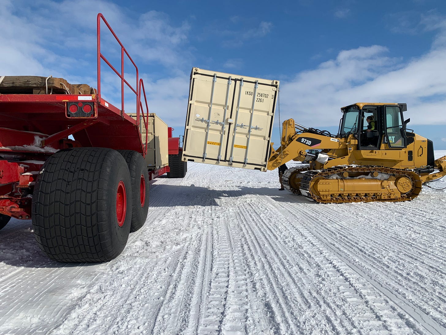 If we’re forking a wooden pallet of four fuel drums, we can use our compact Skid Steer. If we’re moving a 20’ shipping container full of cargo, we need the lifting capacity of our much-larger 973D loader. If we’re pulling 160,000 pound buildings on skis, we need two powerhouse bulldozers, thick shackles, and high-intensity towing cables.