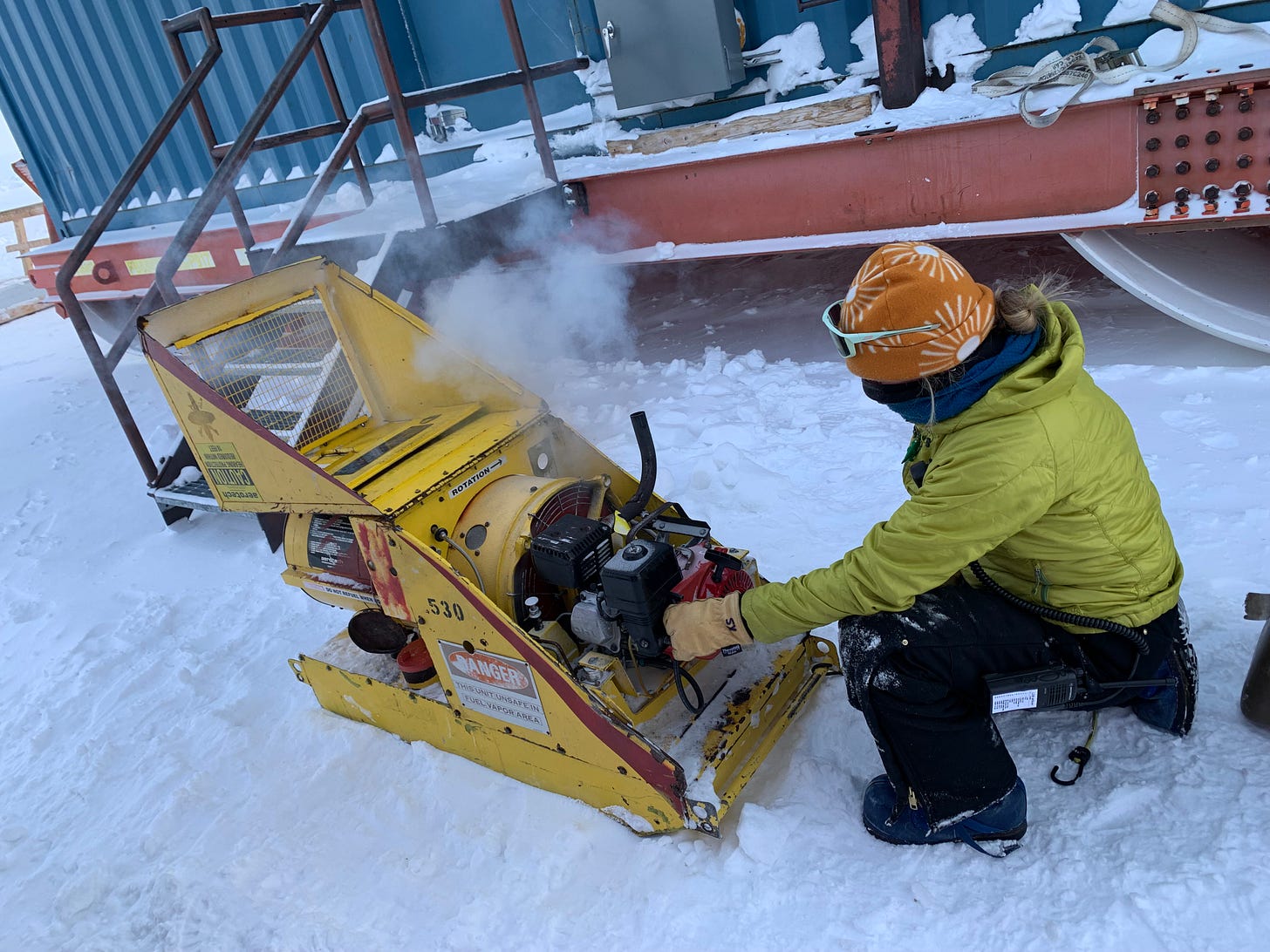 Despite its extraordinary amount of work, the entire break-down process is a period my boss and I look forward to each year. With all of our grantees having departed for the season, our heady often-stressful science support role shifts into a more lighthearted and physical work based partnership with our extensive trades teams. We all take time to cram into a 10’ x 8’ warming shack together to eat hot sandwiches for lunch, we photograph the inventive ways plumbers try to keep their faces warm in piercing winds, we burst into laughter as the electricians and linemen rib each other about who works harder, and — while maintaining our perfect safety record — we may throw in a few fabulous dance moves while directing our steel-tracked forked loader.