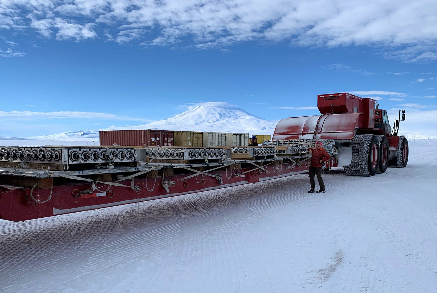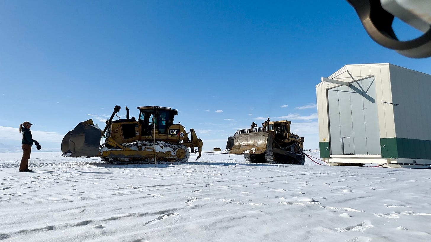 Our two science buildings — the world’s tallest on skis — each weigh 160,000 pounds. If we left them in place over multiple winters, they’d eventually become entirely buried by snow. Instead, we use a forklift to pop the skis out of the snow-turned-ice underneath, connect heavy-duty rigging to two massive bulldozers, and pull them from their places up onto snow berms so we can easily access them next year. This pull puts such a shock load on the buildings that we have to strap everything inside of them to prevent damage.